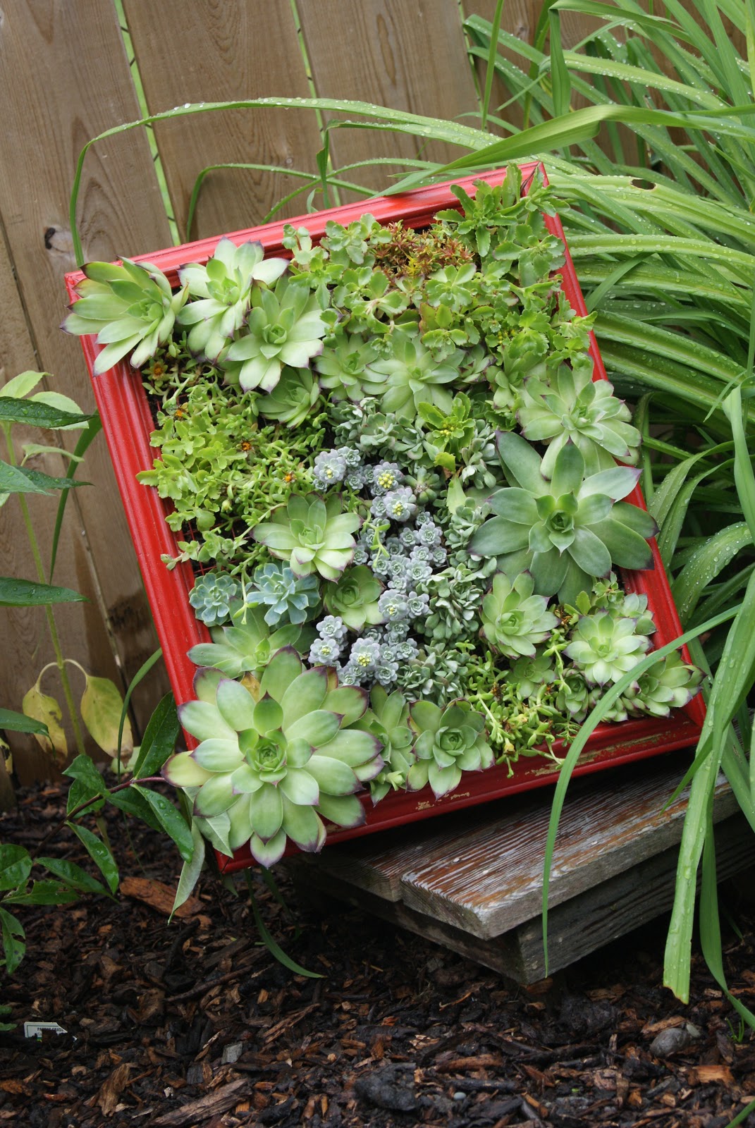 | The final project is complete ready to be hung up on the fence. I love how the red pops around the edge. A few of the plants are almost ready to bloom already too. |